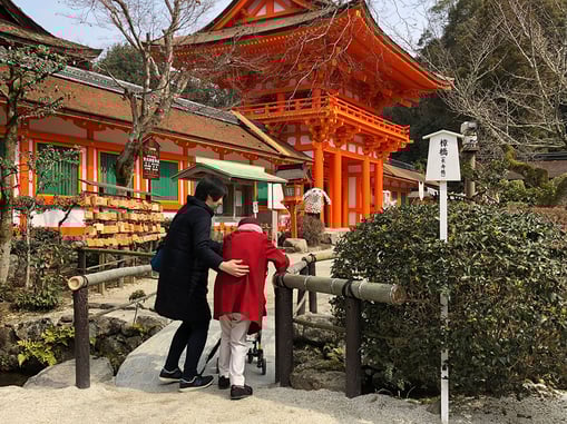 介護施設に入所中の妻と思い出の地を巡りたいとご主人より依頼があり、1泊2日で白浜温泉へ。「認知症もあるし無理」と最初は旅行に反対されていたご家族も、旅先での笑顔のスナップ写真を見て安心され、とても喜ばれました。
