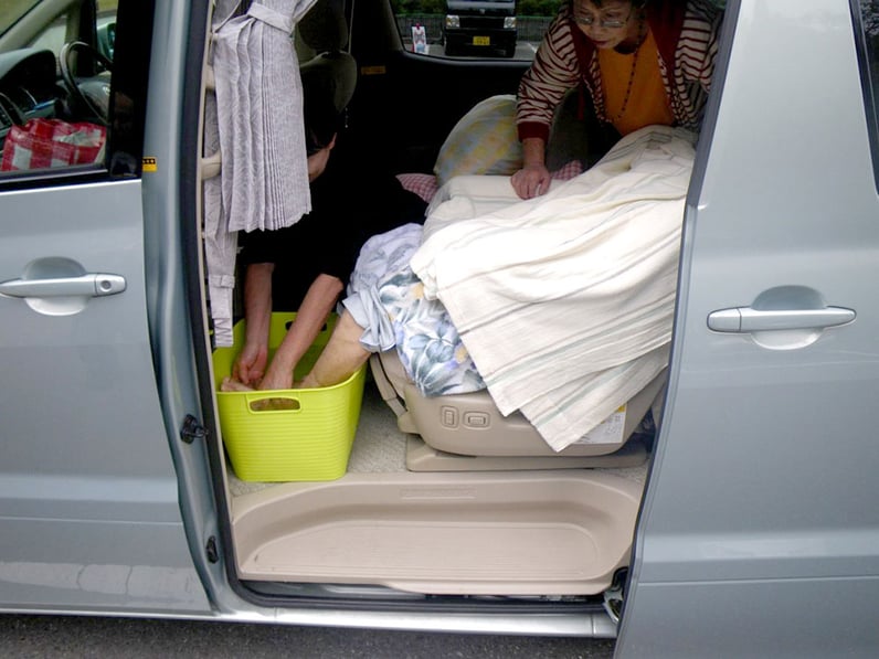 ホスピスに入院中の父親に「人生の最期に旅のプレゼントをしたい」という息子さんの依頼で、看護師同行で天川村へ。洞川温泉で、温泉を車内に運び足浴のサプライズをすると、「たまらんなあ」とうれしい感想をいただきました。